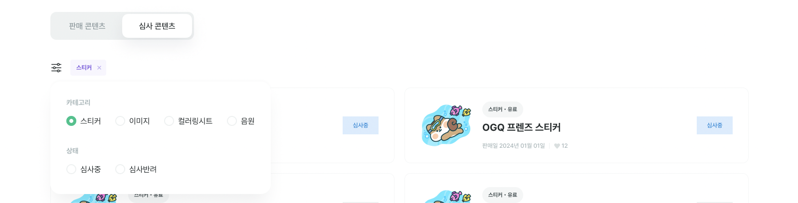 필터 아이콘 버튼을 통해 콘텐츠 카테고리 별 혹은 심사 상태 별(심사중/심사 반려)로 리스트를 필터링할 수 있어요.