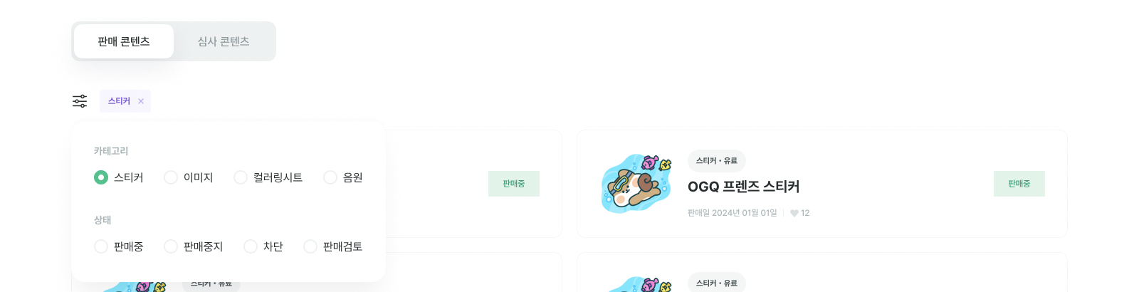 필터 아이콘 버튼을 통해 콘텐츠 카테고리 별 혹은 상태 별(판매중/판매중지/차단/판매검토)로 리스트를 필터링할 수 있어요.