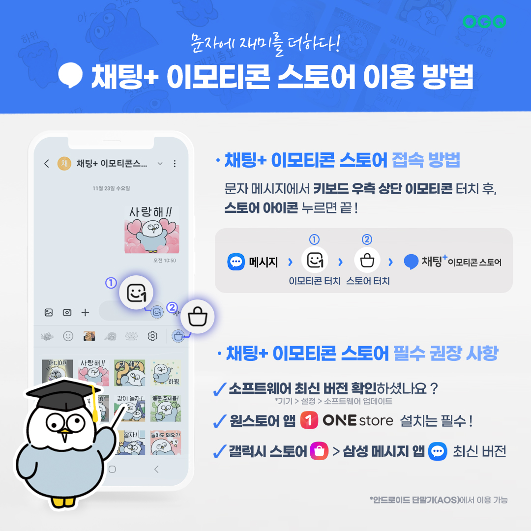 삼성에서 제공하는 메시지 앱 내에서 채팅+ OGQ마켓을 통해 이모티콘을 구매하고,